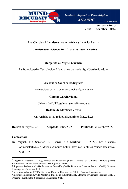 Caracterizar la situación existente en determinada temática debe ser siempre un paso clave para poder diseñar acciones de mejora de una posición a transformar. De acuerdo con esta premisa esta investigación presenta un análisis comparado de las investigaciones desarrolladas por los investigadores de ciencias administrativas en el las regiones de América Latina y África. Para este propósito se realiza un análisis de las publicaciones sobre Ciencias Administrativas de investigadores del continente reportadas en Scopus. Luego de una revisión inicial del 100% de estas publicaciones se trabaja con cerca del 87 % de estas definiendo las funciones o áreas del conocimiento donde estas se desarrollan, de igual modo se analiza la evolución en el tiempo y los sectores y países donde las mismas se aplican. Además, se caracterizan algunos elementos relativos a los vínculos de colaboración entre los países en función del desarrollo de las investigaciones, las principales revistas donde se han publicado los resultados investigativos y el comportamiento de los autores con mayores números de publicaciones